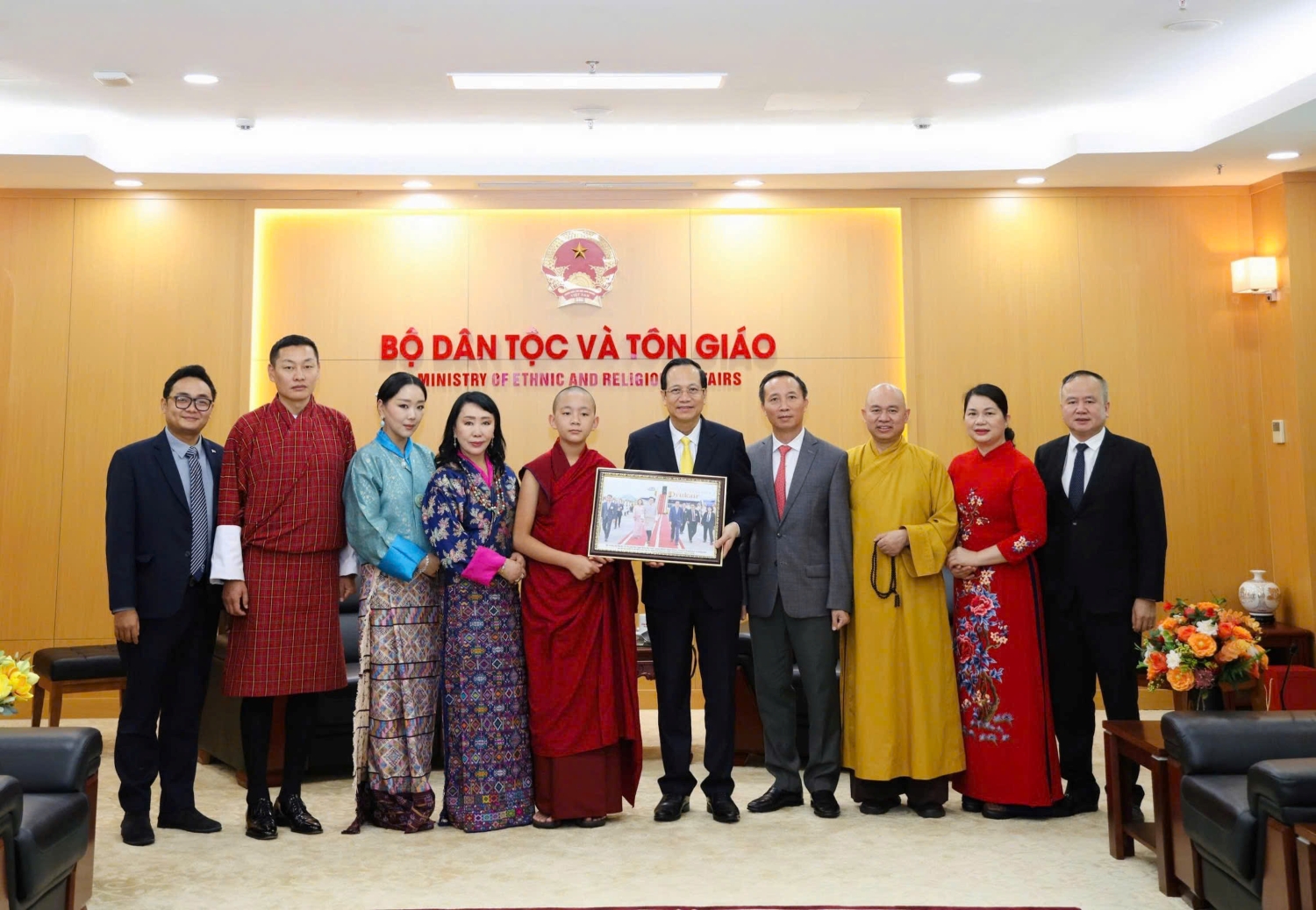 Bộ trưởng trao tặng Hoàng tôn Vairochana Rinpoche và phái đoàn hoàng gia Bhutan bức ảnh chụp cùng Quốc vương Bhutan Jigme Khesar Namgyel Wangchuck trong chuyến thăm Việt Nam dịp tháng 8/2025