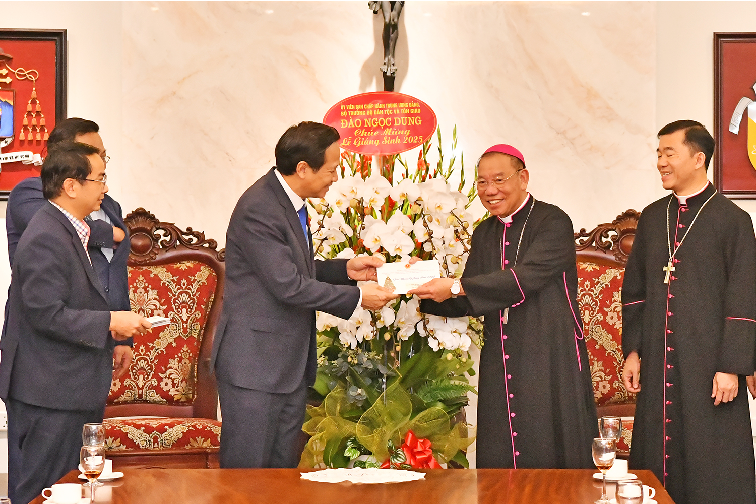 Bộ trưởng Đào Ngọc Dung tặng quà và gửi lời chúc mừng Giáng sinh an lành, hạnh phúc đến với Tổng Giám mục Vũ Văn Thiên, các linh mục, tu sĩ và đồng bào Công giáo